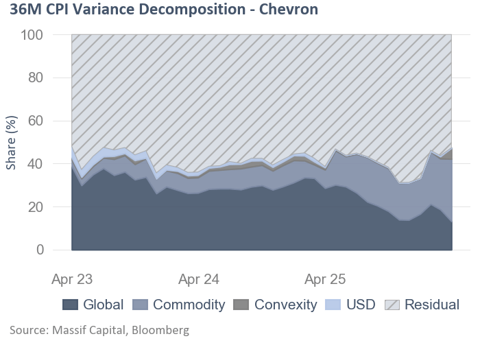 Take, for example, Diamondback Energy (FANG). Over the last 36 months (end of February), FANG has returned roughly 14.7%, of which the residual contributed a -28.9%, commodity variables contributed -11.6%, the global equity factor contributed 39.4%, and USD contributed -0.6%. The large negative residual over the last 36 months could reflect any number of things, the market's negative repricing of the stock for acquisition integration risk, or perhaps elevated leverage from the 2024 Endeavor deal, rather than indicating poor commodity exposure; the commodity factor was negative, but the residual had a larger negative impact. The residual is a low-frequency variable: small daily increments, serially persistent, compounding slowly over time.