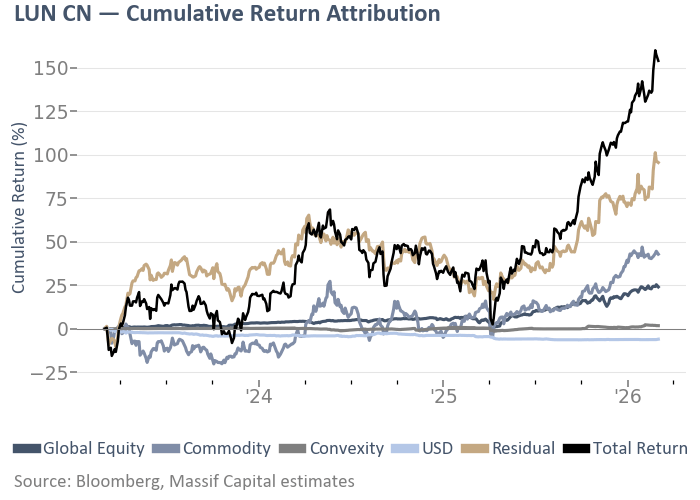 Lundin Mining offers a striking contrast. Its 36-month CPI of 16.0 classifies it as non-commodity, and the cross-horizon profile is unusual: the CPI declines from 16.0 at 36 months to 14.6 at 120 days and collapses to 3.2 at 60 days. Yet Lundin returned 160.0%, with copper contributing 46.3% and explaining 60% of the daily movement, the residual an extraordinary 96.3%, and if included in the variance chart (which is not standard statistical practice, only 56.8% of the daily movement). This company story was driven by the Filo Mining acquisition re-rating and operational execution across Chilean and Brazilian operations. The convexity loading of 0.15 is also favorable, the closest to symmetry of any copper miner tested.
