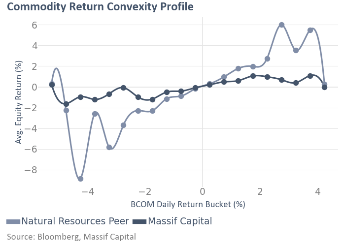 We believe we see evidence of this in the portfolio construction of Massif Capital peers. The results of a piecewise regression of Massif Capital's returns and those of a peer vs. the Bloomberg Commodity Index show returns bucketed by the performance of the Bloomberg Commodity Index, so how does Massif Capital and the peer do when the BCOM draws down 4%, or is up 4%, or is down 2%, etc? The Massif Capital portfolio is highly concentrated but constructed in a convexity aggregation-aware way, versus those of a peer who has a completely different approach to portfolio construction that is highly diversified across natural resources producers (50 or so positions vs 15), and to ensure we are not cherry picking, we have chosen a peer whose returns since our inception mirror ours. By building the portfolio in a convexity-aware way, we have dramatically reduced the sensitivity of our returns to moves in the overall commodity complex. This does not come without a cost. In up markets, this peer outperforms us, but in down markets, we outperform them. The result is our portfolio has a high but trailing upside capture ratio vs. the MSCI Commodity Producers Index (15.8% vs. peer 24.5%, Massif Capital's upside capture is 35% lower), but a downside capture ratio that is 66.8% lower (7.1% vs. 21.6%).