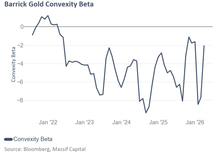 Barrick Mining records a 36-month CPI of 36.2 with a global market beta of 0.010, making it the purest gold-factor play in the entire sample (commodity accounts for 86.0% of explained variance). Over 36 months, Barrick returned 177.0%, of which gold contributed an extraordinary 254.5%, more than the entire return, while the global market subtracted 14.8% and the residual was a 7.6%. Gold, and almost gold alone, drove Barrick. But the convexity loading of −2.0 is severely negative: Barrick amplifies gold's largest declines and dampens its largest rallies. In a 186% bull market, this asymmetry is tolerable. In a flat or declining gold environment, negative convexity becomes a confiscatory tax. Looking at the convexity beta over time is useful here as it demonstrates how much it moves around.