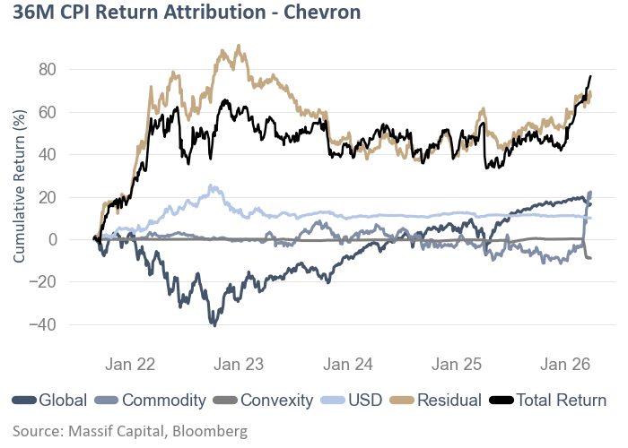 Equinor introduces a structural wrinkle absent from the American peers we reviewed in our broader analysis testing this model: a negative global market beta of −0.60. Where the American names rise and fall with broad equities, Equinor moves against them. This negative market loading, combined with a commodity beta of 0.58 and a USD beta of −0.22, creates a distinctive factor profile. Over 36 months, Equinor returned -15.1%, of which the commodity variables contributed -2.1%, the residual 0.8%, USD -1.5% and the global equity factor -10.2%. For the commodity investor, Equinor's negative market beta removes the equity contamination that dilutes the signal of every other oil stock. And yet even this structural advantage does not lift the CPI above non-commodity territory.